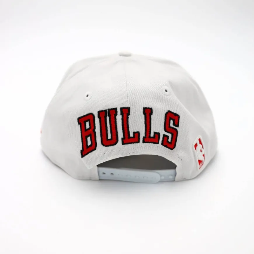 Cappellino, da uomo di New Era. Realizzato in poliestere color bianco e rosso con logo dei Chicago Bulls e “BULLS” ricamato posteriormente. Possibilità di regolarne la larghezza.