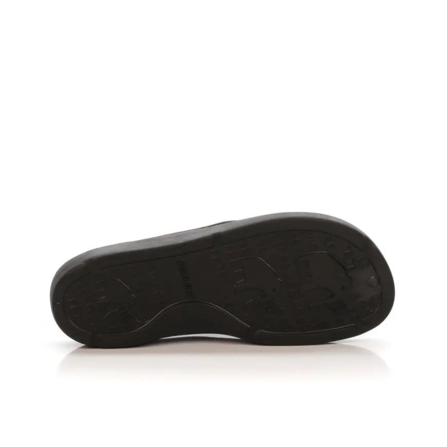 Comodo infradito uomo di PETER LEGWOOD. Realizzato in eva reticolato colore nero, materiale antibatterico e termo formabile. Brevetto AEQUOS ergonomico, altezza tacco 2,5 cm, prodotto MADE IN ITALY.