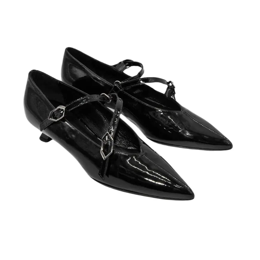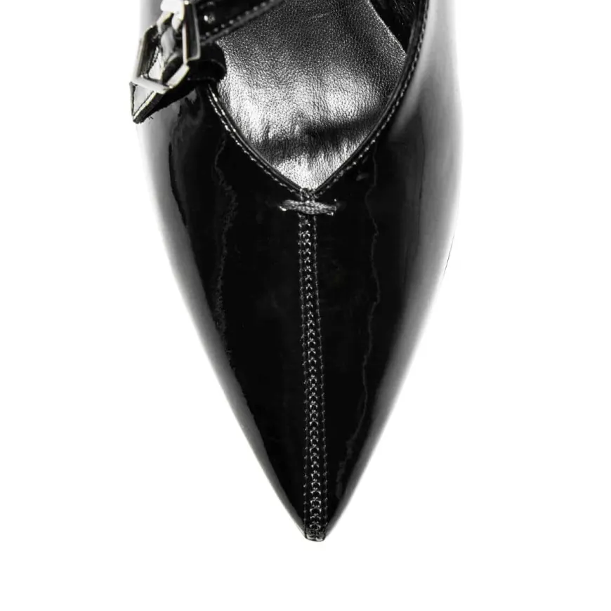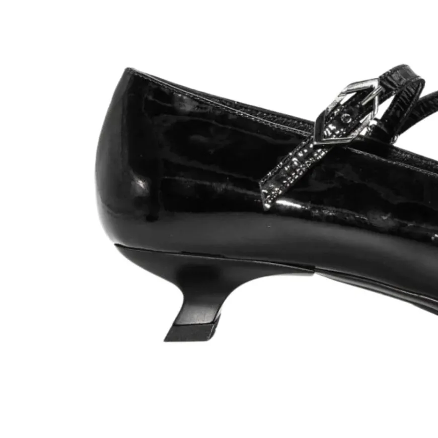 Ballerina con tacco a rocchetto di POESIE VENEZIANE realizzata in pelle verniciata nera con doppio cinturino regolabile. Interno e sottopiede , non estraibile, foderati in pelle. Suola in gomma.