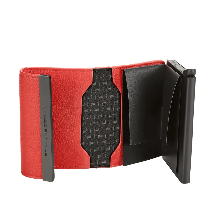 Esclusivo portacarte Porsche Design X Secrid Cardholder. Portatessere in metallo con funzione pop-up e rivestimento in pelle con scomparto per banconote e spazio per sei carte di credito.