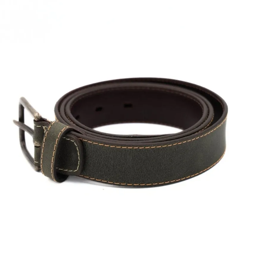 Cintura da uomo di PRATENICE realizzata in morbida pelle verde arricchita da cuciture a contrasto, con fibbia effetto vintage.