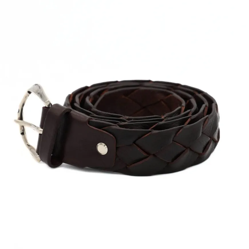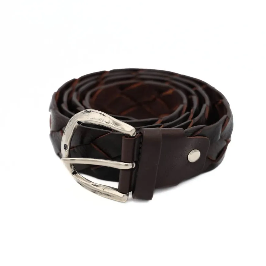 Cintura da uomo di PRATENICE realizzata in morbida pelle testa di moro intrecciata, con fibbia effetto vintage.