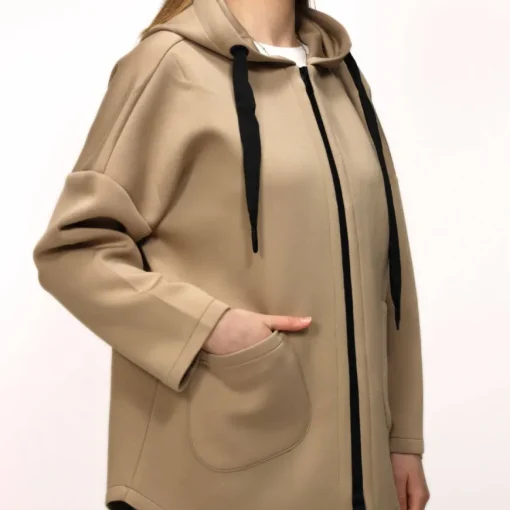 Giubbetto da donna di RINO&PELLE, realizzato in neoprene beige con cappuccio. Taglio over con tasche frontali e chiusura con zip.