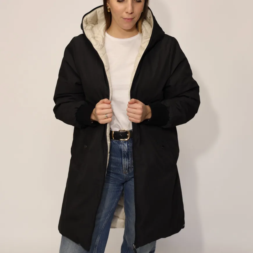 Parka, doubleface da donna di RINO&PELLE. Realizzato in cotone nero con interno piumino bianco. Chiusura con zip.