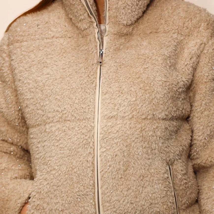 Pelliccia, da donna di RINO&PELLE. Realizzata in poliestere brillantinato beige. Chiusura con zip.