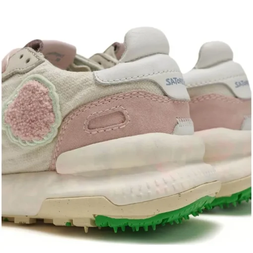 Sneakers da donna di SATORISAN modello CHACRONA, realizzata in tessuto beige con inserti in camoscio e pelle. Interno in tessuto e sottopiede anatomico con suoletta ad alta intensità di comfort, in pelle. Suola in gomma morbida con tappini e superficie del battistrada per una massima presa. Sneakers ispirata agli anni 80, super confortevole e resistente.