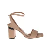 Sandalo da donna di SILVIA ROSSINI. Tomaia realizzata in pelle nude. Interno e sottopiede foderato in pelle. Chiusura con cinturino regolabile alla caviglia. Suola in cuoio e tacco rivestito in pelle con inserto. Made in Italy.