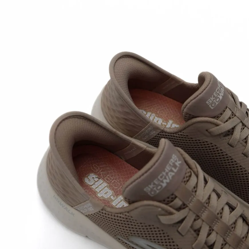 Slipon donna di SKECHERS. Tomaia realizzata in tessuto tecnico taupe. Interno foderato in tessuto con sottopiede anatomico. Chiusura con lacci elastici. Suola in gomma. Calzatura molto leggera. Lavabile in lavatrice a bassa temperatura