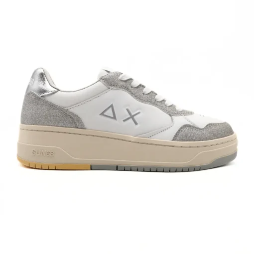Sneaker, da donna, di SUN68. Tomaia realizzata in pelle bianca con inserti glitterati argento. Interno e sottopiede, removibile, foderati in tessuto e pelle. Chiusura con lacci (lacci argento glitterati in dotazione). Suola platform in gomma (4,5cm).