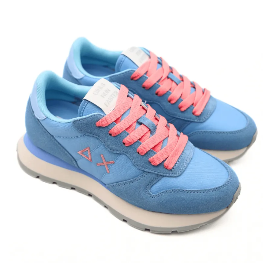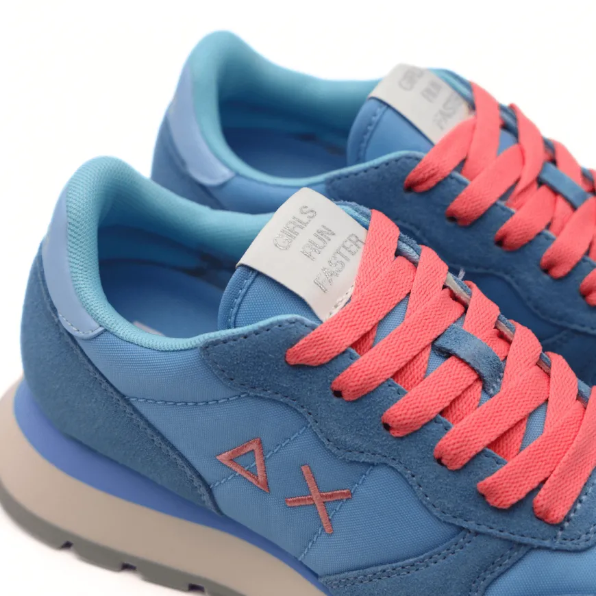 Sneaker, da donna, di SUN68. Tomaia realizzata in tessuto con inserti in camoscio azzurri. Interno e sottopiede, removibile, foderati in tessuto. Chiusura con lacci (lacci azzurri in dotazione). Suola running in gomma.