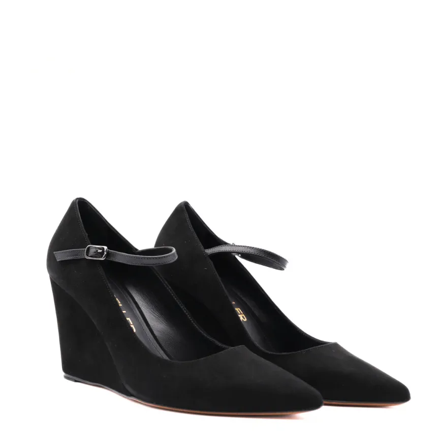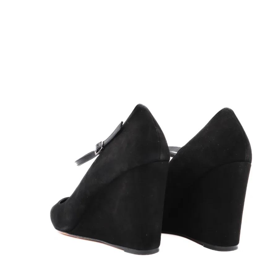 Décolleté di THE SELLER realizzata in morbida pelle scamosciata nera. La tomaia presenta un cinturino regolabile, interno e sottopiede completamente rivestiti in pelle e suola in cuoio.