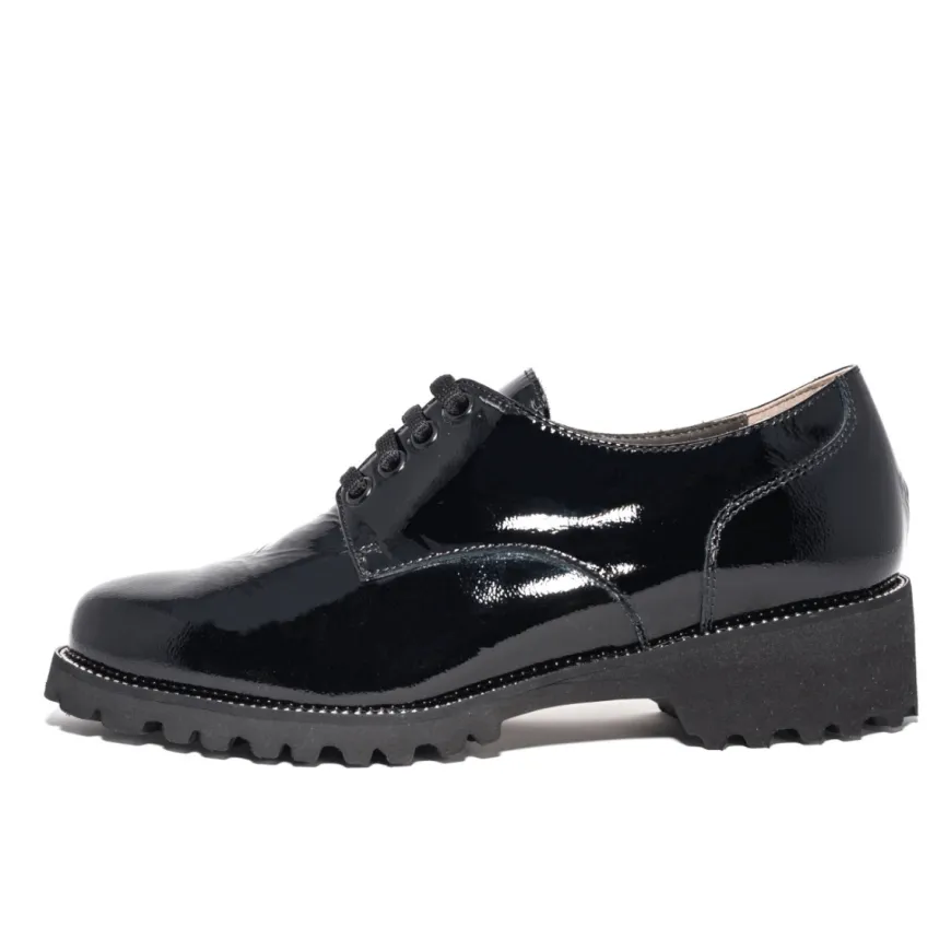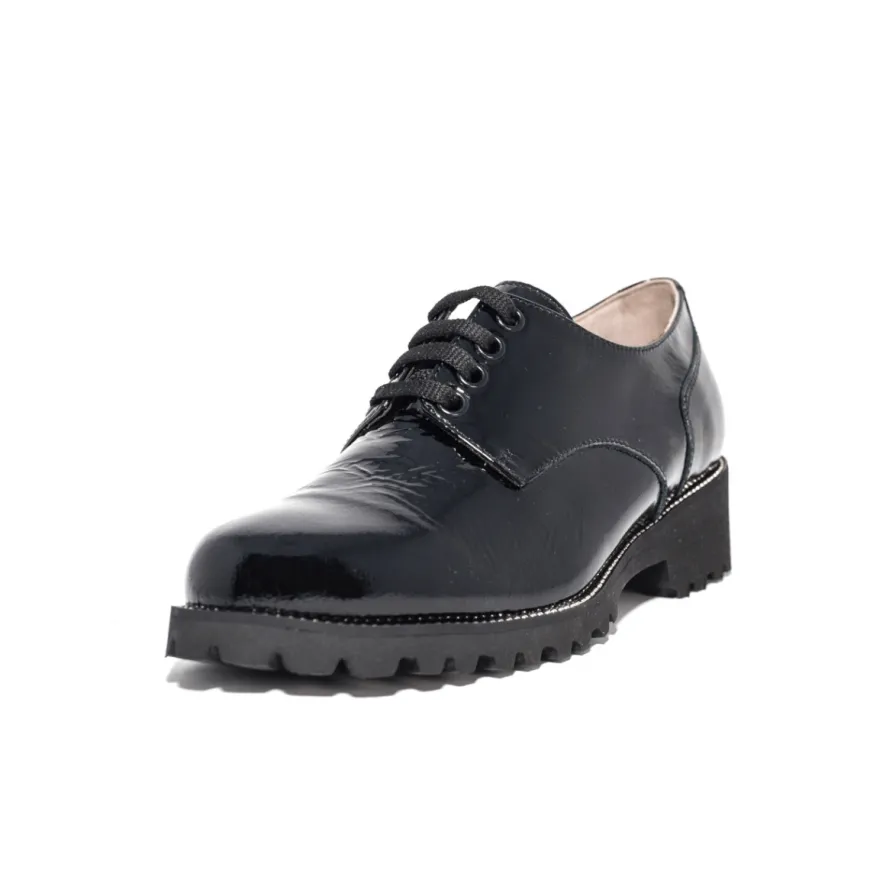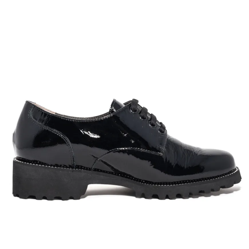 Stringata da donna di FRATELLI TOMASI in pelle verniciata nera. Interno realizzato in pelle con morbido sottopiede non estraibile. Chiusura con lacci. Suola in gomma (altezza tacco: 4cm).