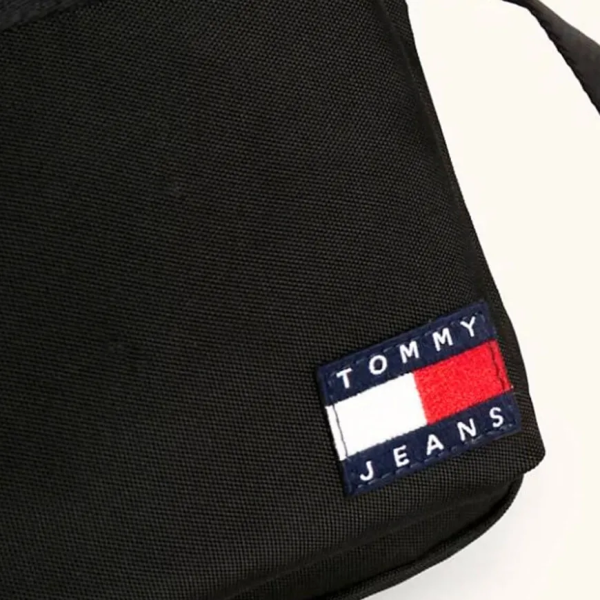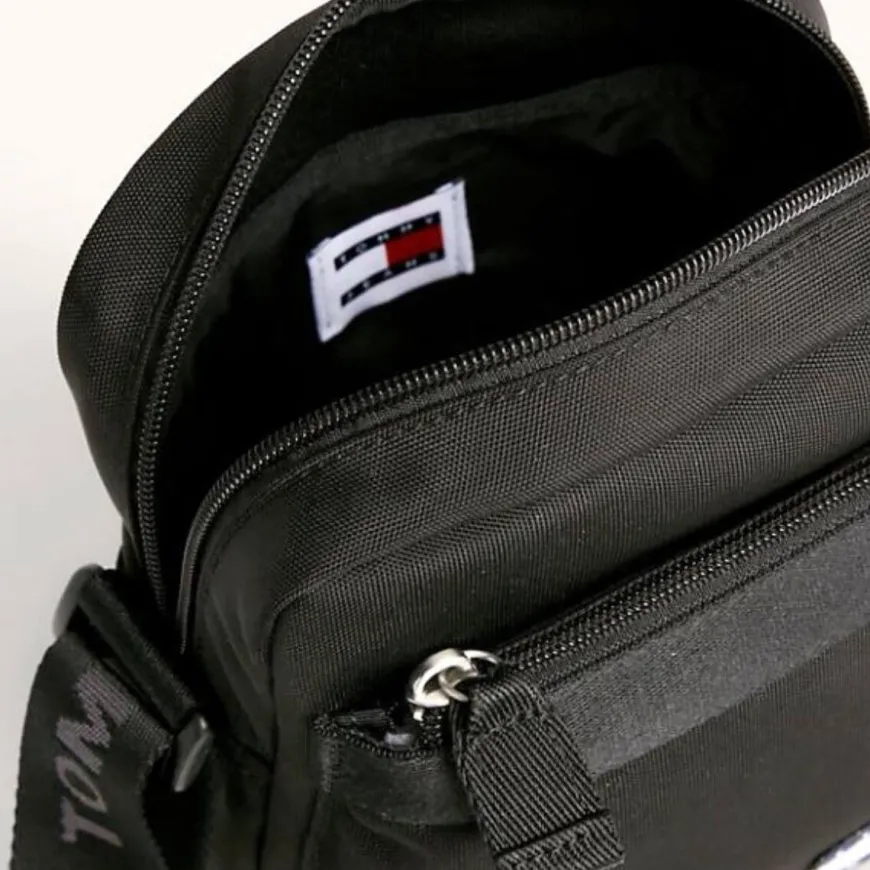 Borsello da uomo di TOMMY HILFIGER, realizzato in tessuto nero con logo ricamato. Doppia tasca per organizzarti meglio. Tracolla in tessuto regolabile.