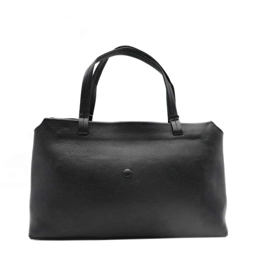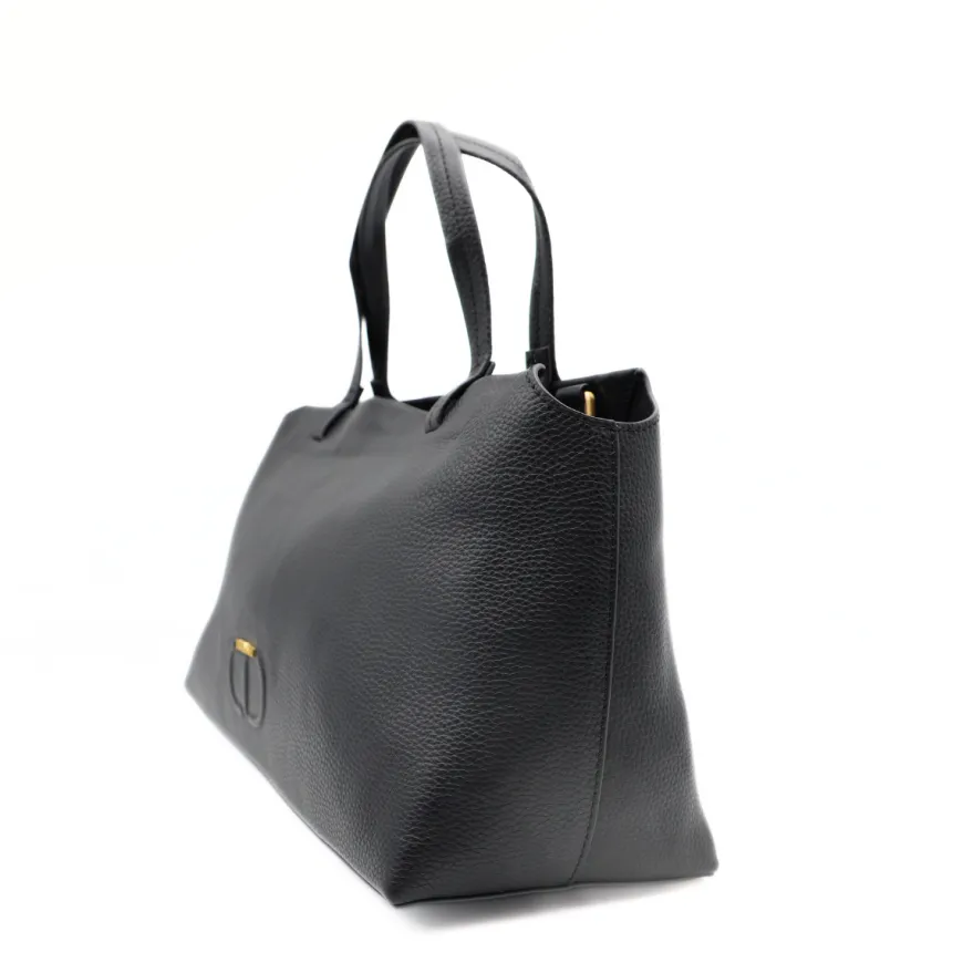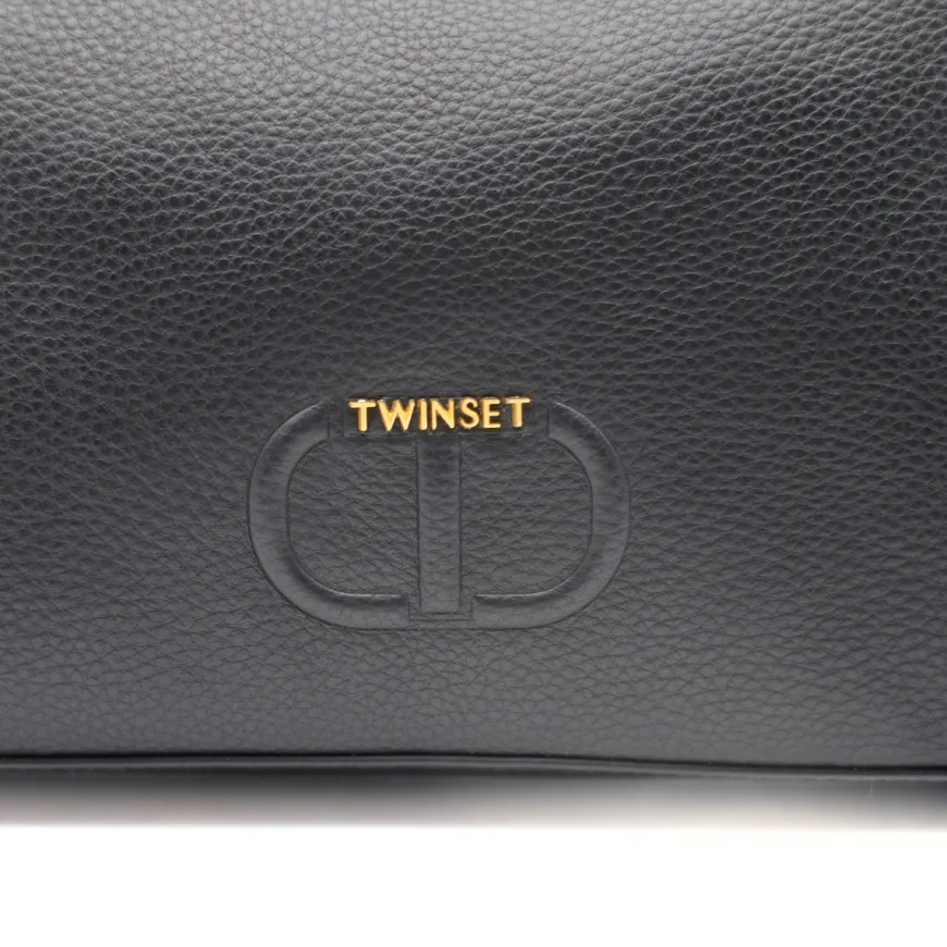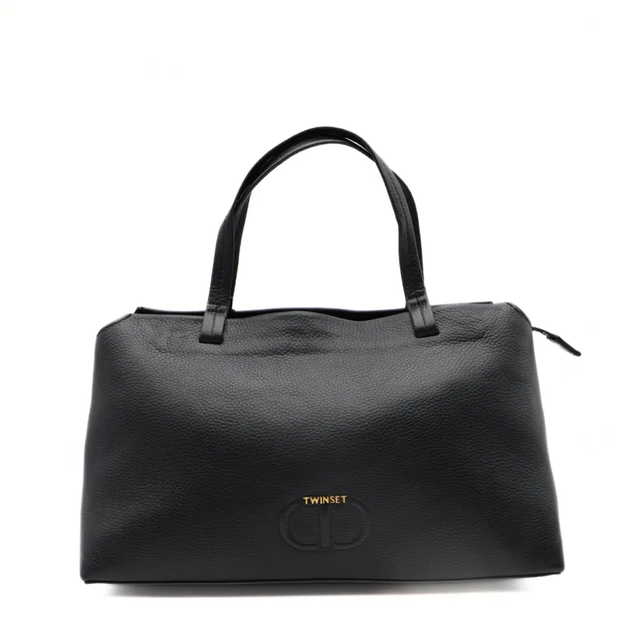 Borsa a mano con doppio manico di TWINSET, realizzata in pelle nero con logo oro e simbolo in rilievo. Interno unico comparto con tasche accessorie. Chiusura con zip. Possibilità di mettere la tracolla.