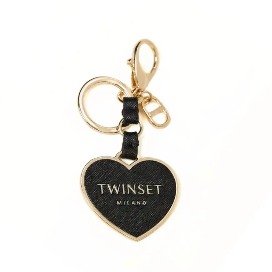 Portachiavi a cuore di TWINSET in metallo dorato con logo lettering, moschettone, anello e charm Oval T.