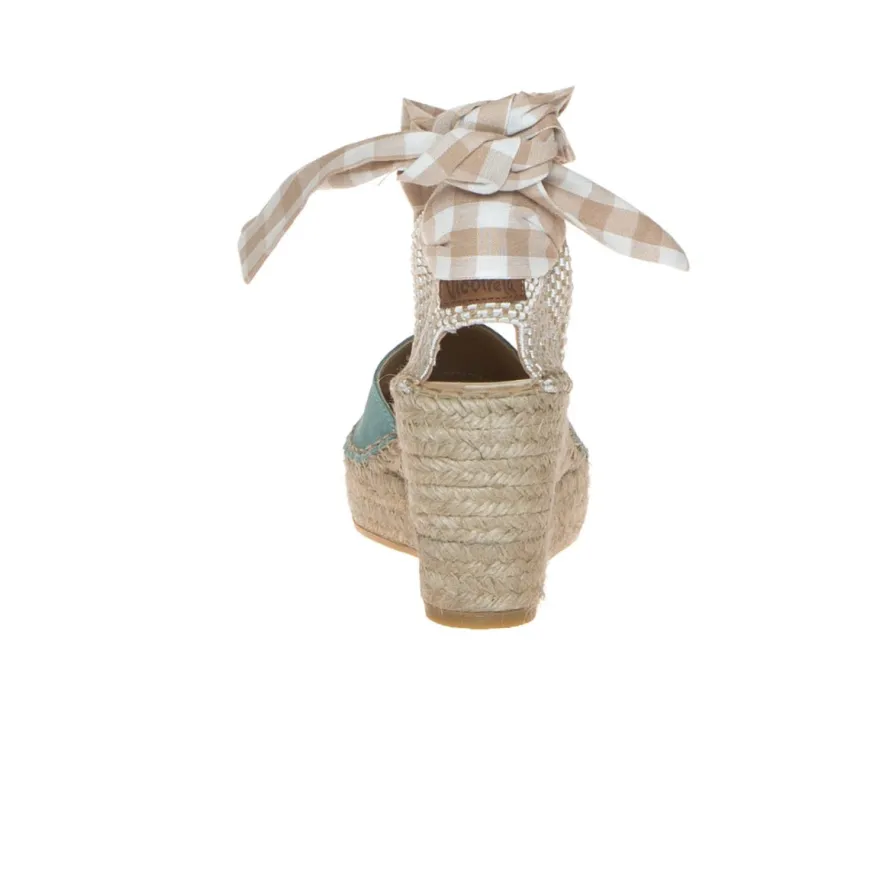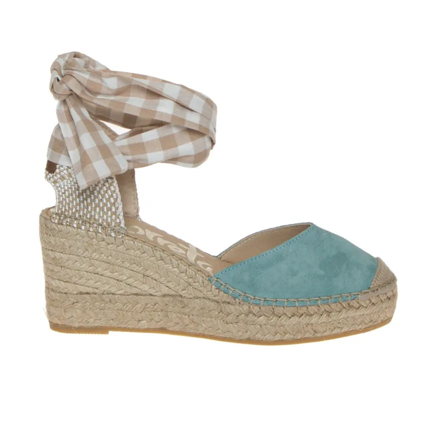 Sandalo zeppa casual in corda di VIDORRETA, realizzato con puntale in camoscio azzurro turchese; zona posteriore con “contrafforte” nel tallone in corda, chiuso con foulard fantasia a quardri. Internamente foderata e nel sottopiede con morbido cuscinetto rivestito in pelle. Suola rifinita in corda e battistrada in gomma antiscivolo, tacco 8 cm, platform 3 cm. Calzatura made in Spain.