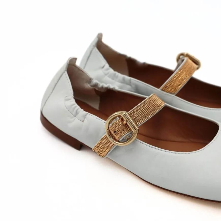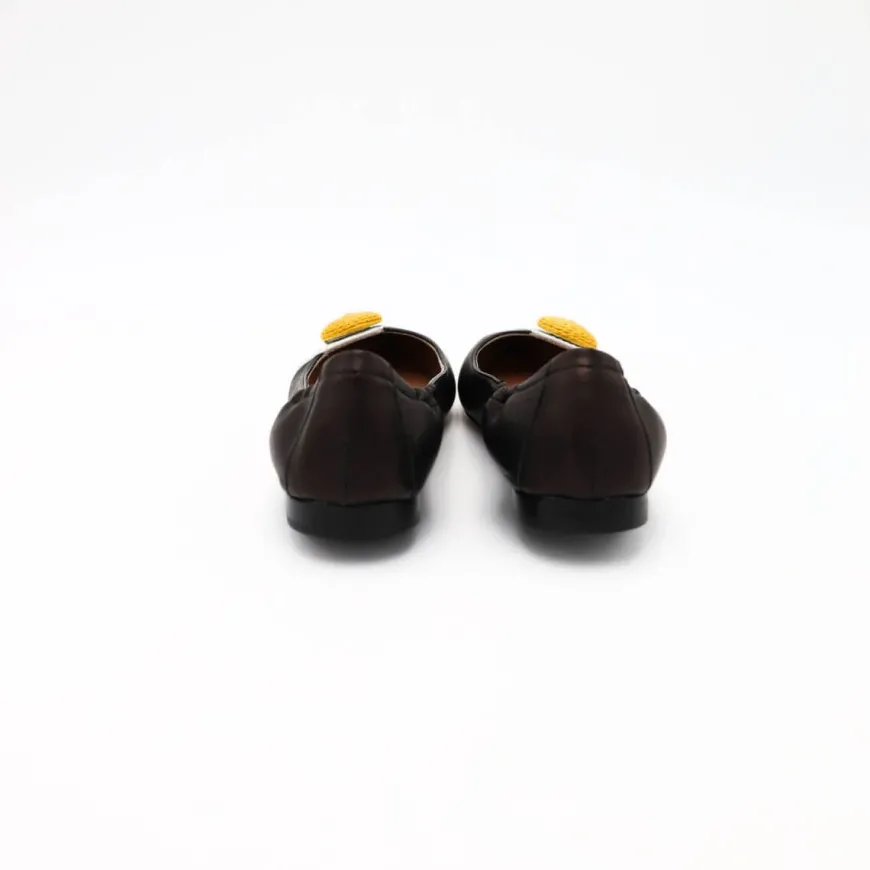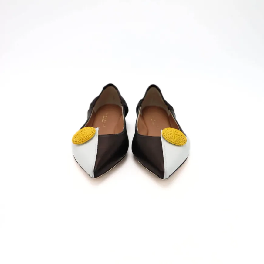 Ballerina a punta da donna di VIOLA RICCI, realizzata in pelle bianca e nera con accessorio giallo. Elastico sul tallone. Inteno e sottopiede morbido in pelle. Suola in cuoio con mezza pianta in gomma. Calzata piccola.