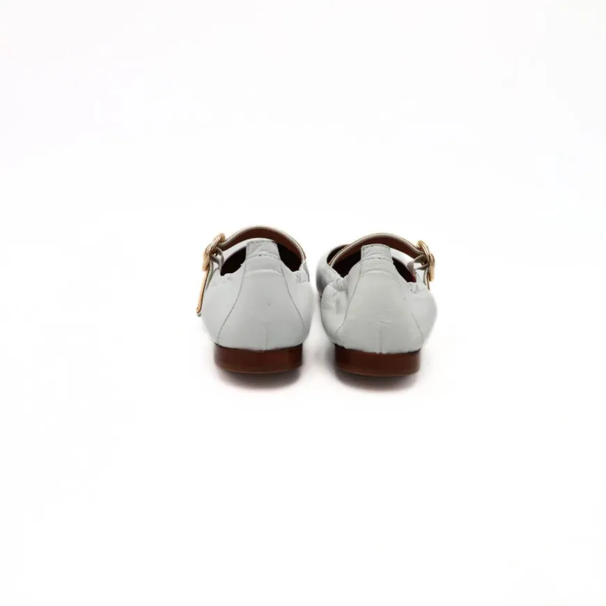 Ballerina bebè da donna di VIOLA RICCI, realizzata in pelle bianca con cinturino con strass oro e fibbia. Elastico sul tallone. Inteno e sottopiede morbido in pelle. Suola in cuoio con mezza pianta in gomma. Calzata piccola.